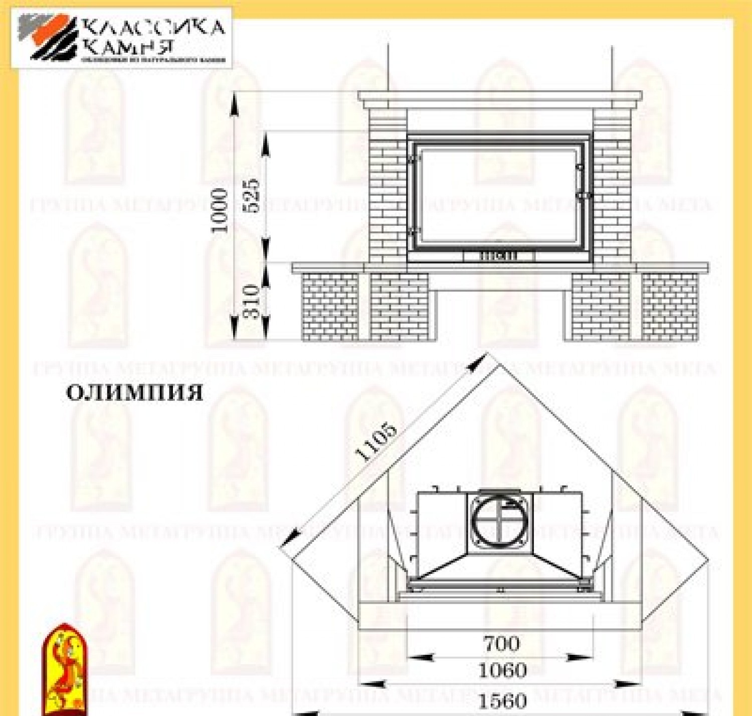 Материал: Колотый доломит (жёлтого цвета), натуральный мрамор с обработкой «Антик» (бежево-серого цвета), капители - камень Meta Stone™ (бежевого цвета), балка - термообработанная сосна