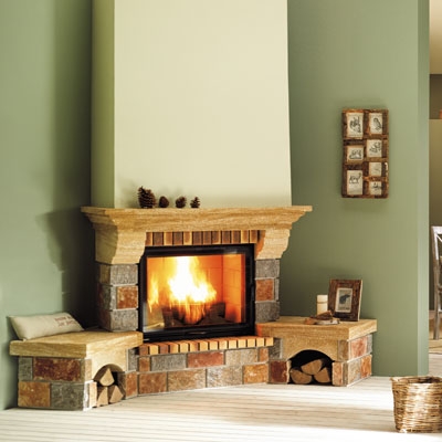 Угловой камин. Изготовлен из камня Castillon + разноцветный бут + Iroko.